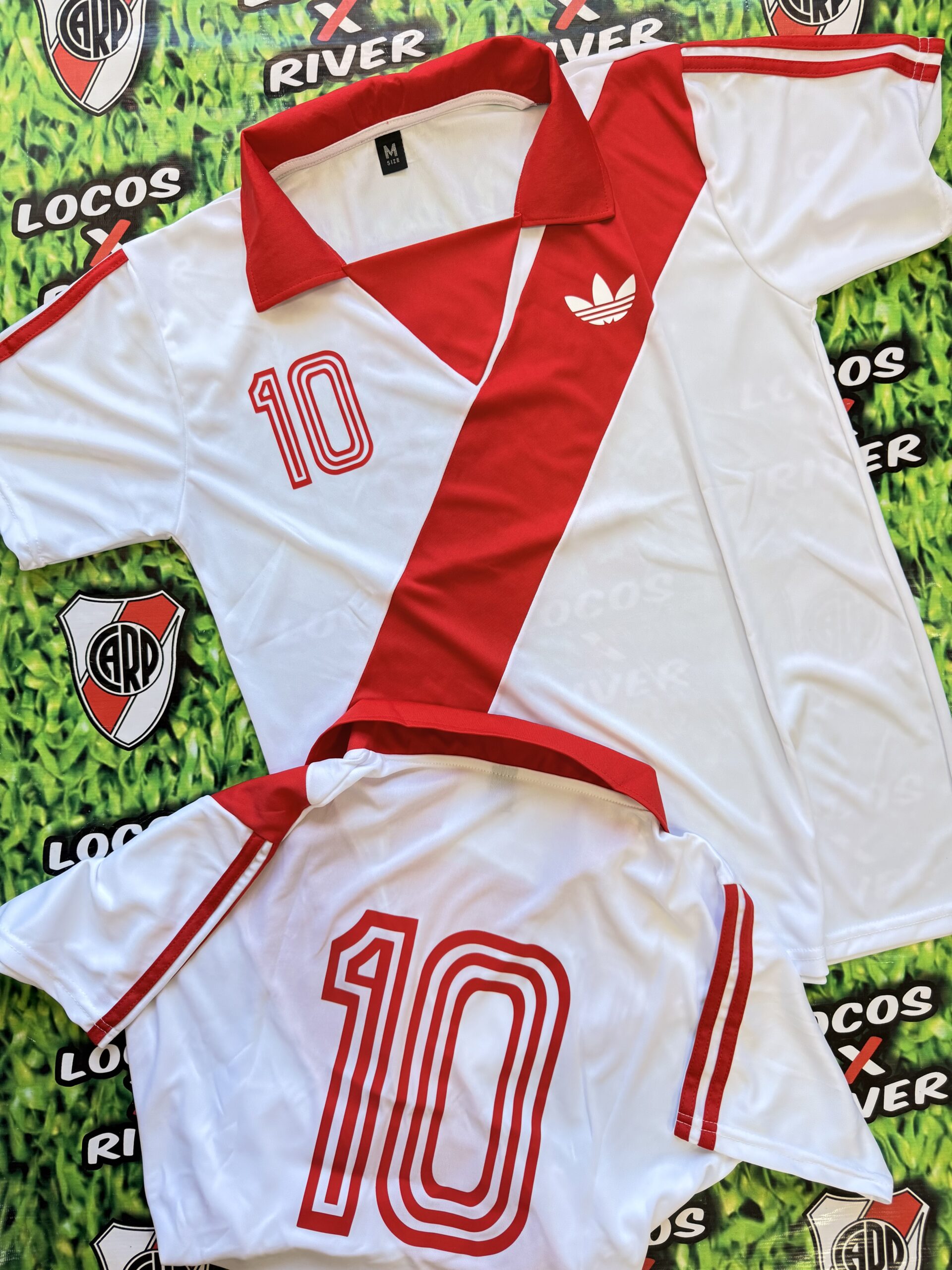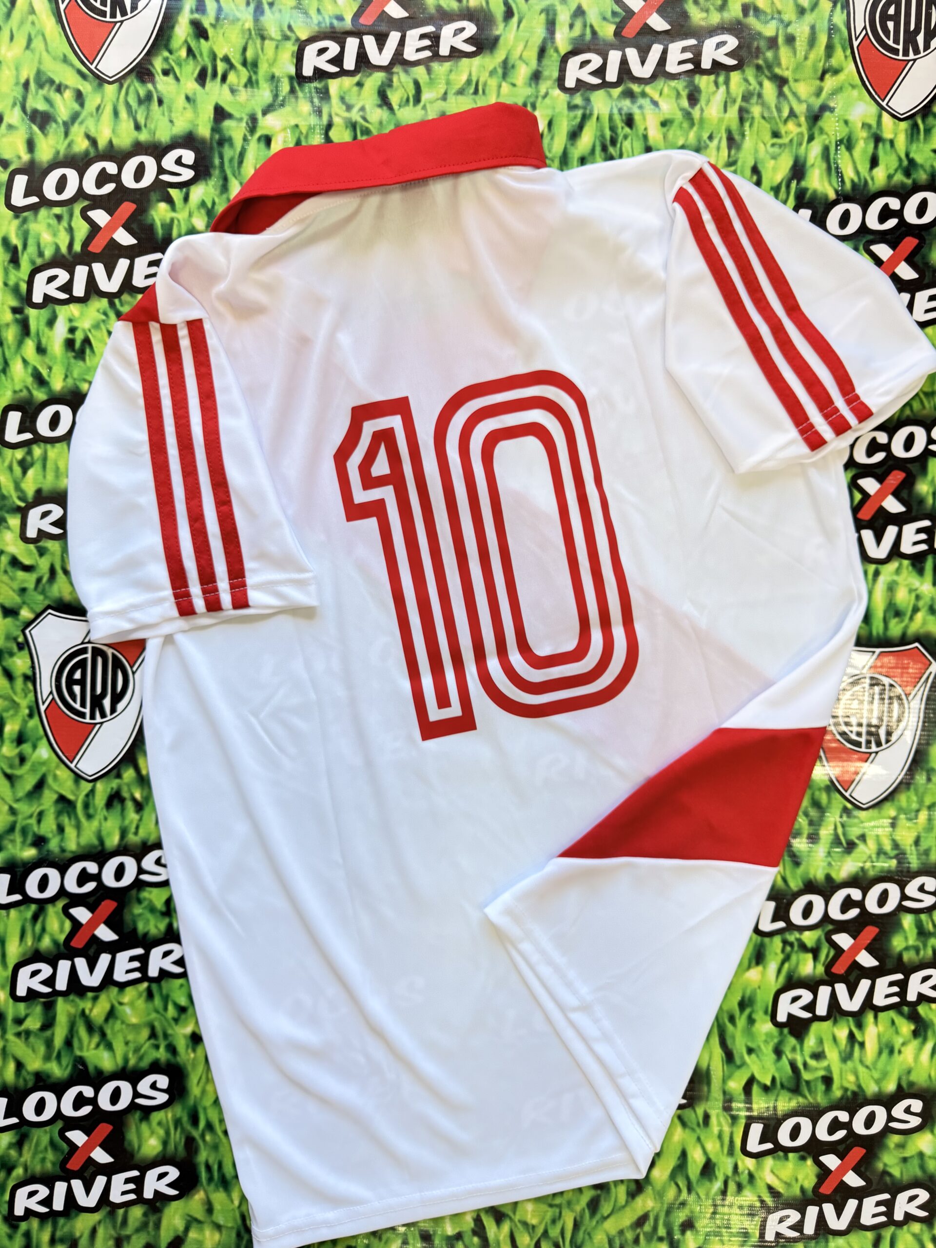 Presenta el tradicional fondo blanco con la banda roja cruzada, un cuello tipo polo con escote en V, y el 10 en frente y espalda.
