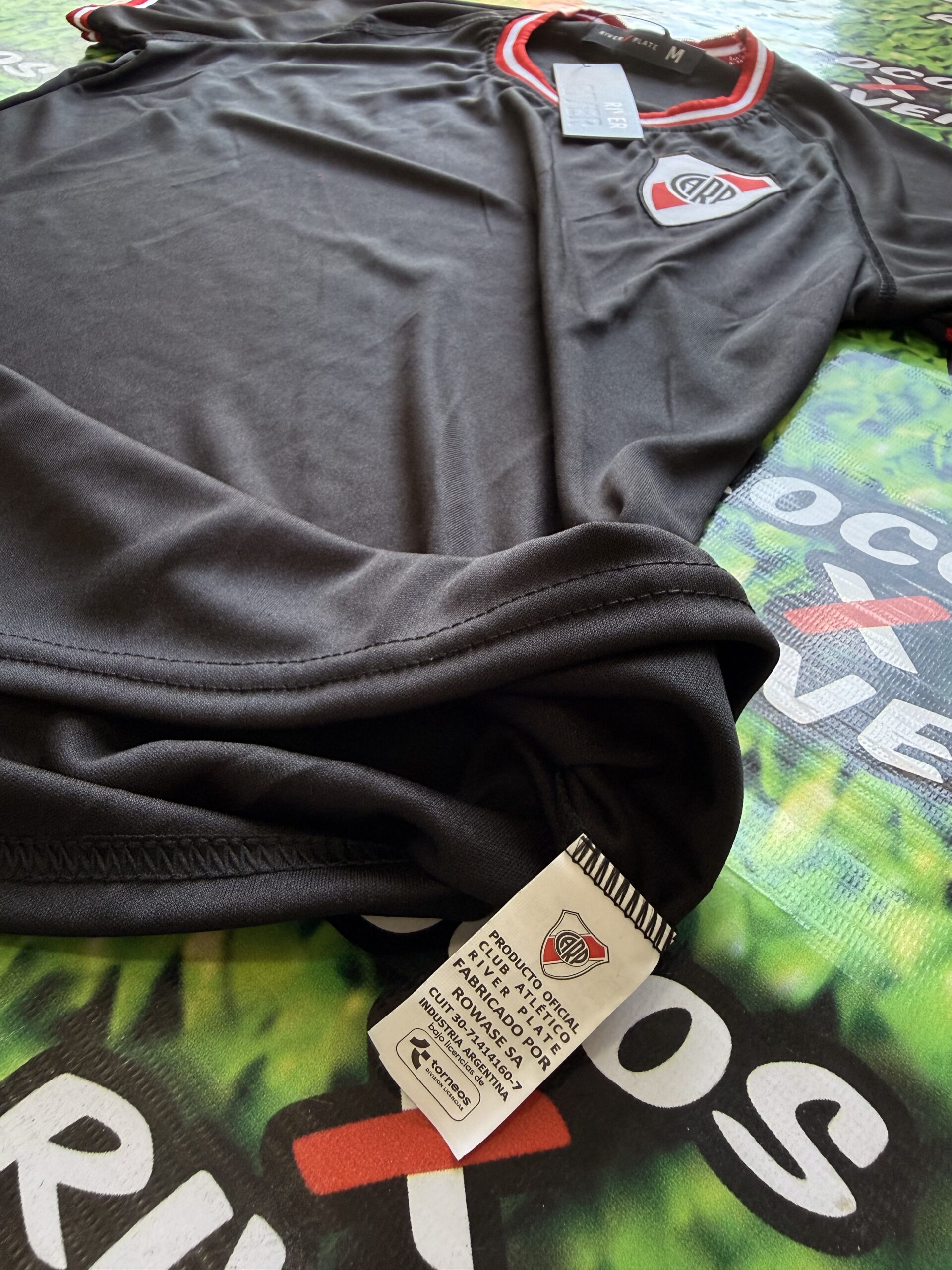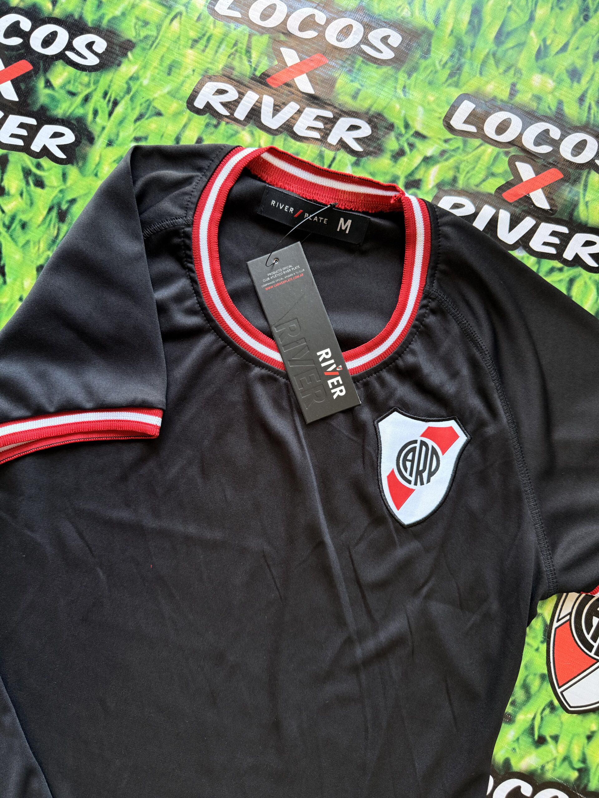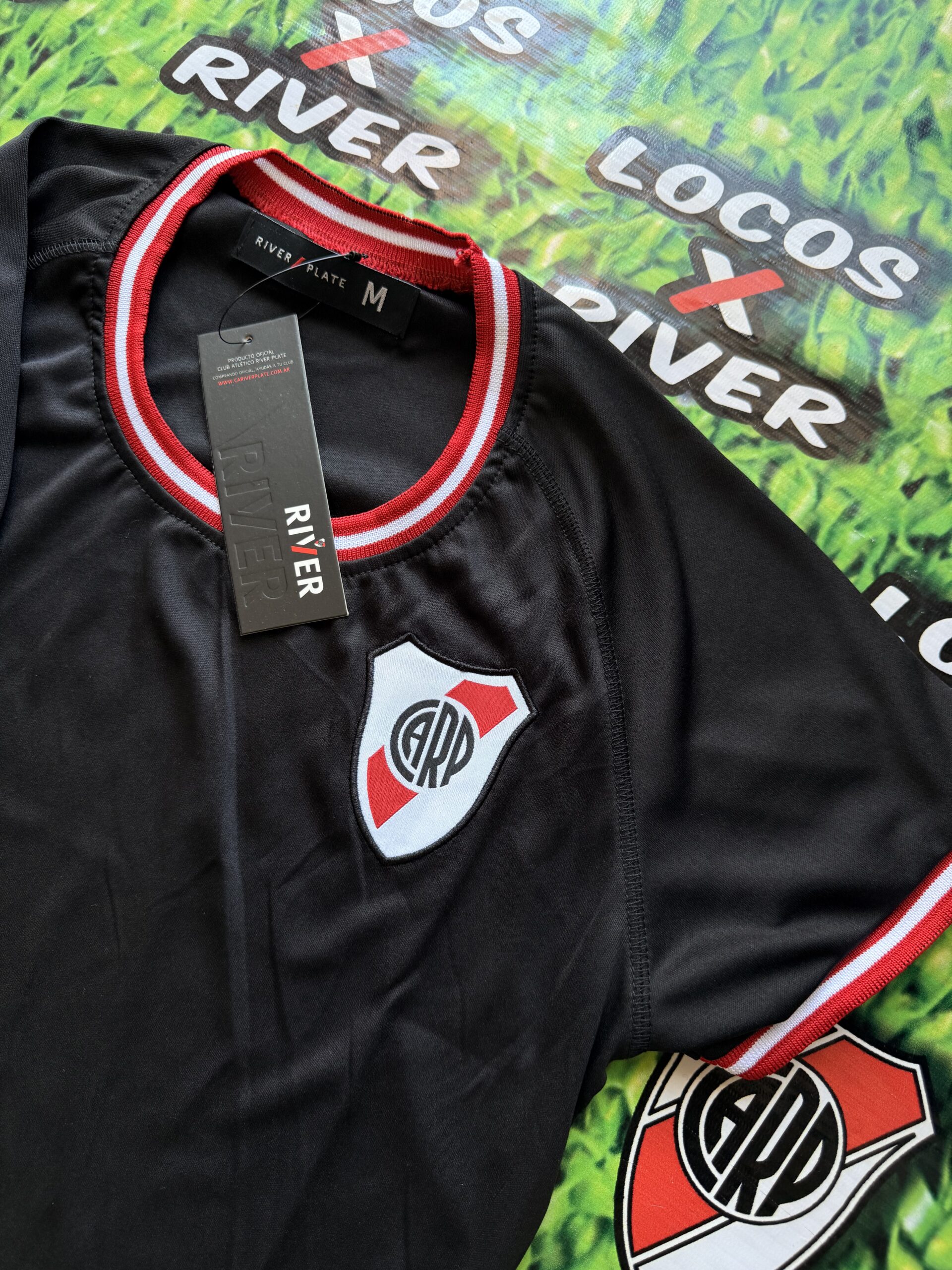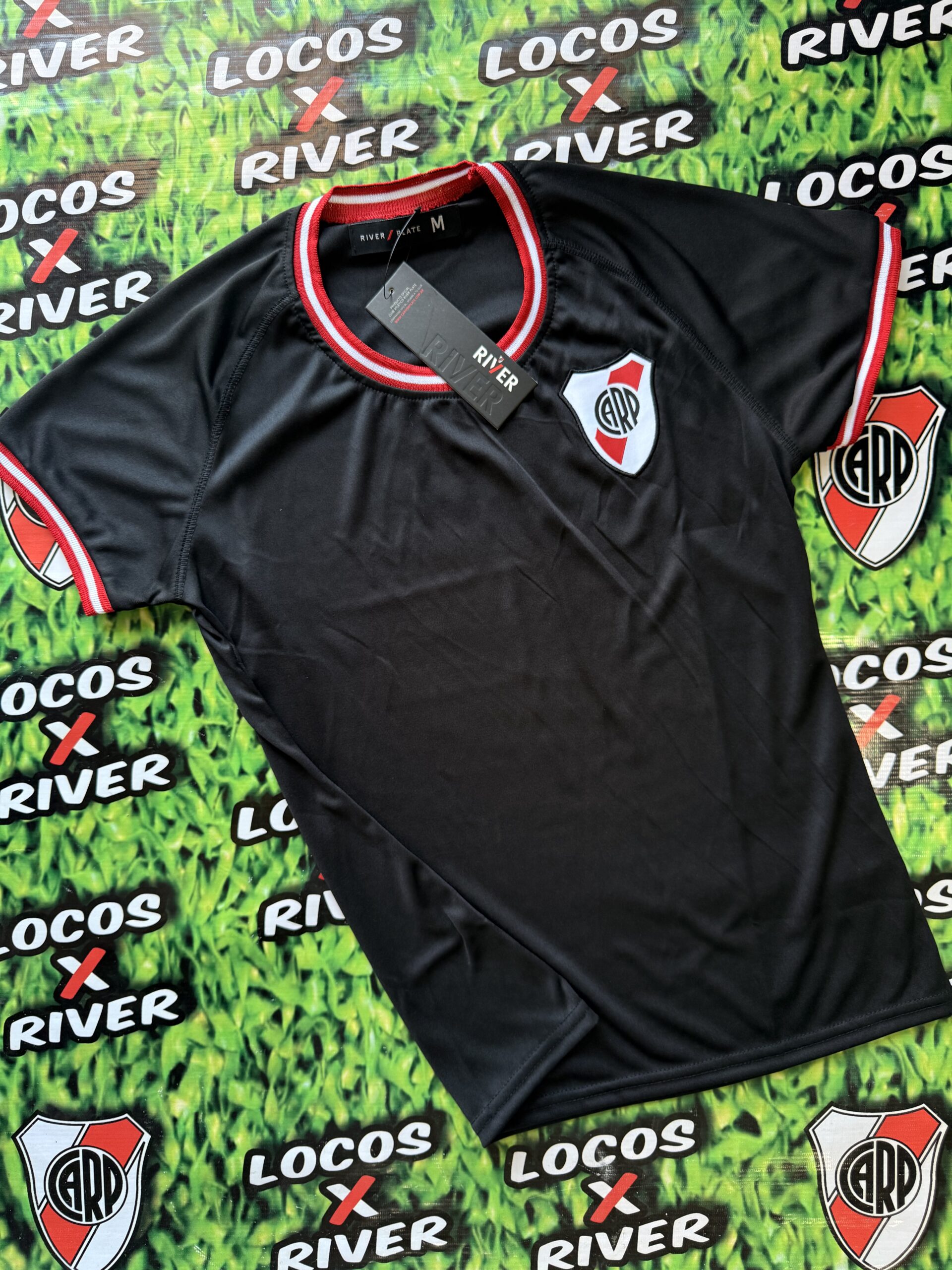 De base negra, presenta cuello redondo y un diseño cuidado con detalles característicos de River Plate en blanco y rojo tanto en el cuello como en las mangas, logrando un estilo moderno y femenino sin perder la identidad del club.